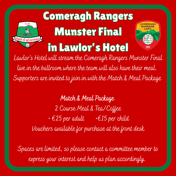 Join us in the ballroom as Lawlor’s Hotel stream the Munster Final live, where the team will also enjoy their meal.